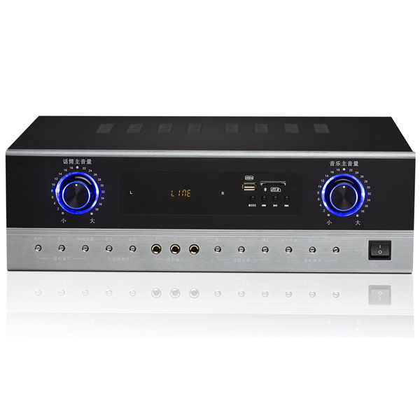 产品描述:三路音乐输入:一路后板音乐输入、一路MP3输入、一路收音输入 音乐调节:高低音、左右平衡、总音量 话筒调节:每路增益、回声、延时、高低音、混响深度 后板连接:可外接均衡、录音输出、一路音频输入 面板指示灯:电源指示、左右声道电平 MP3读卡:可接插SD卡和USB卡,可读多种MP3版本