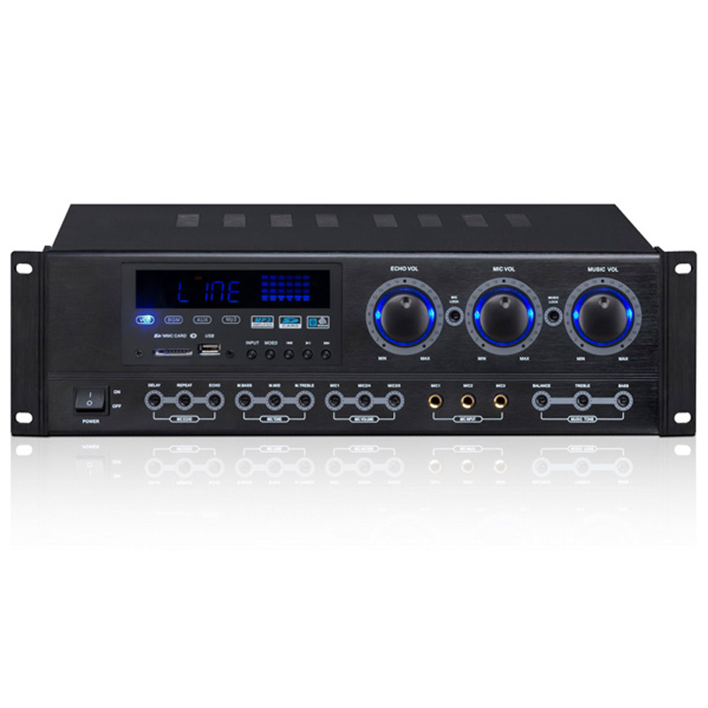 产品描述:三路音乐输入:一路后板音乐输入、一路MP3输入、一路收音输入 音乐调节:高低音、左右平衡、总音量 话筒调节:每路增益、回声、延时、高低音、混响深度 后板连接:可外接均衡、录音输出、一路音频输入 面板指示灯:电源指示、左右声道电平 MP3读卡:可接插SD卡和USB卡,可读多种MP3版本